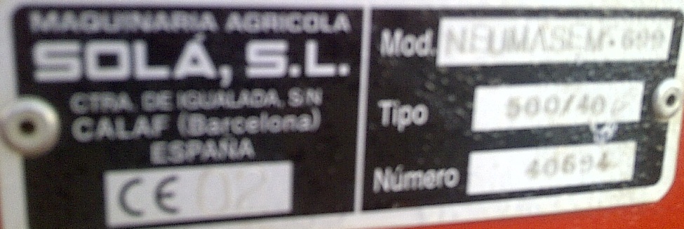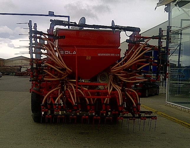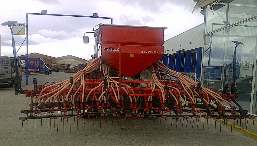 Sembradora Neumática marca Sola, modelo Neumasem 699, de 5 metros de ancho, con 40 rejas de bota, con trazadores, cultivador, tabla, cortes parciales y cortes totales.